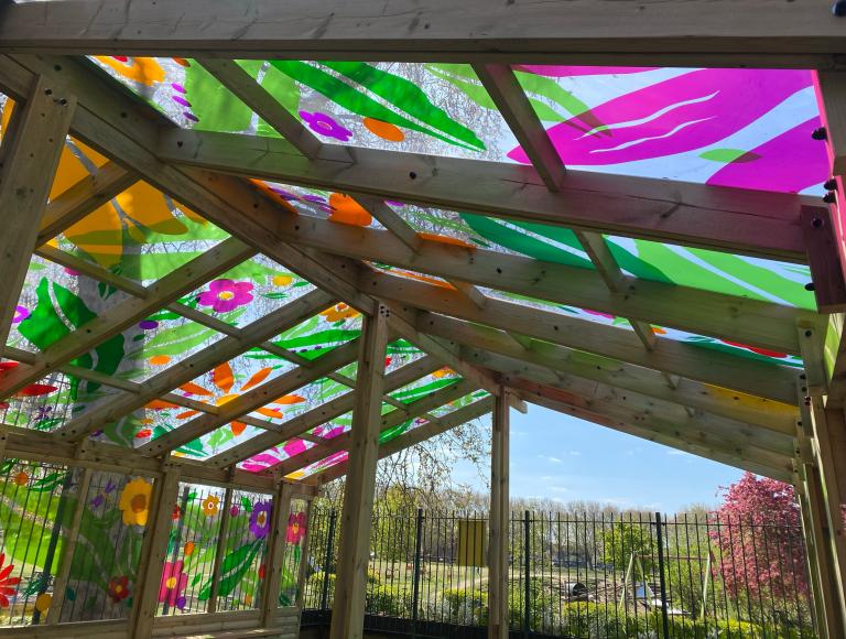 Outdoor classrooms with colourful roof canopies provide a magical space to play and learn.